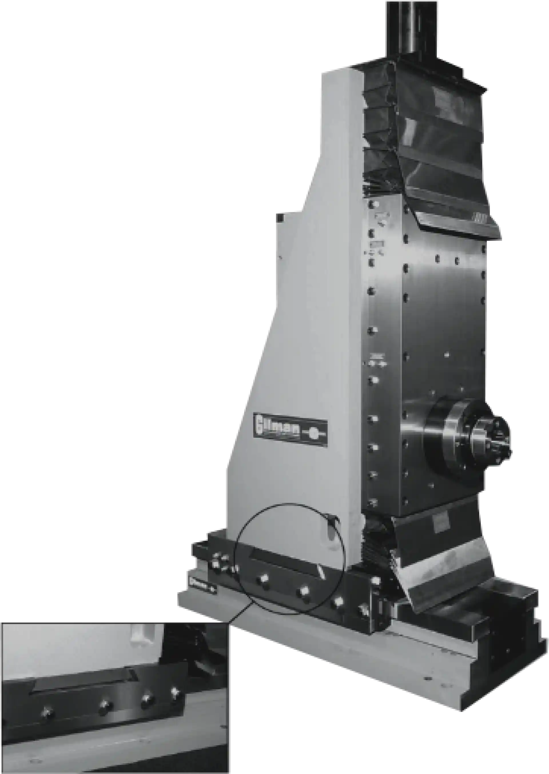 Demonstrating Gilman’s ability to work closely with customers' engineers to realize optimal solutions, both the travel and adjustment requirements were achieved by a single design change. A new casting was designed to accommodate the additional travel and the bottom of the vertical bracket was cast with a male dovetail, while the “Z” axis hardened way saddle was then machined with the complementary female dovetail groove. A manual lead screw drive with a micrometer dial was added, completing the design change. This creative solution delivered the requisite machining travels while eliminating one entire tolerance level (a separate complete slide for the "X" travel).