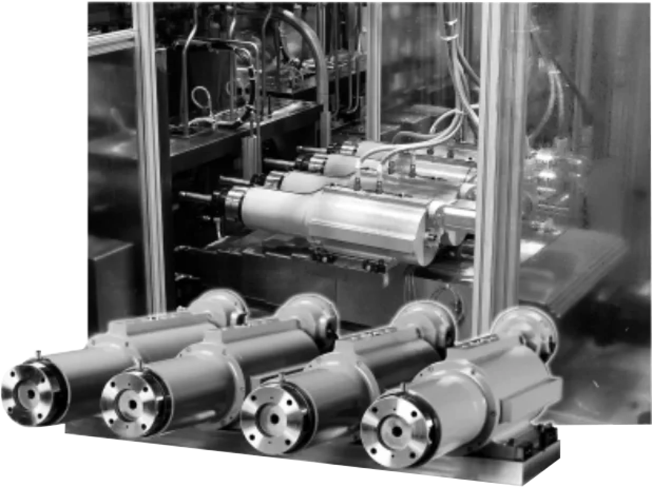 Four Gilman GLS120 motorized spindles mounted on a HWL24 “low profile” hardened way slide were chosen as the solution. The spindles featured flanged-foot housings secured to a precision mounting plate atop the ground ball screw- driven slide. The GLS120 spindles were extremely low in vibration. Their integral motor design minimized the number of moving parts and the spindle shaft and rotor were precision balanced before assembly. Precision ABEC 7/9 bearings, a triplex set in the spindle nose and a duplex in the rear, delivered rotational accuracy with a maximum runout of .0001”. Liquid cooling of the spindle housing provided a clean and stable environment for the bearings and motor. The integral motor design of the spindles also contributed to a very compact station. Individual integral motors also helped achieve a control goal for the builder. The ability of the line to process fewer than the four parts per station was felt to be a key feature that would keep the line running in the event that any of the processing positions at any of the line’s stations went down. The rough cut boring station that preceded this finishing station also featured Gilman Precision spindles and components.