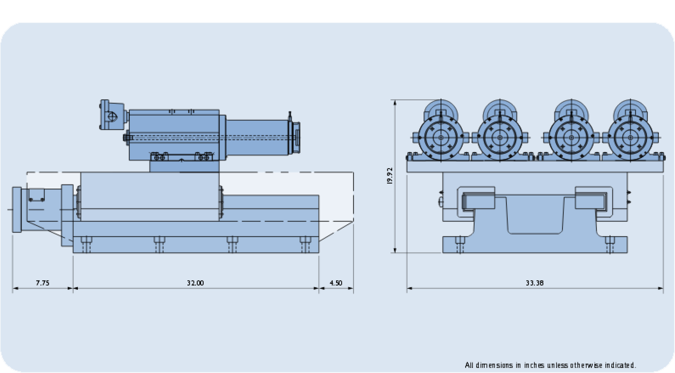 The spindles at each of the four processing positions had to be highly accurate and vibration free to achieve the end user’s surface finish needs. They also had to be mounted close together and maintain a center-to-center dimension of .001”. Since the four spindles would have to move up to the work and then back away from it after the operation was complete, a precision slide would be required. Overall reliability of the station had to meet the “24-7-365” production needs of today’s automotive manufacturing environment.
