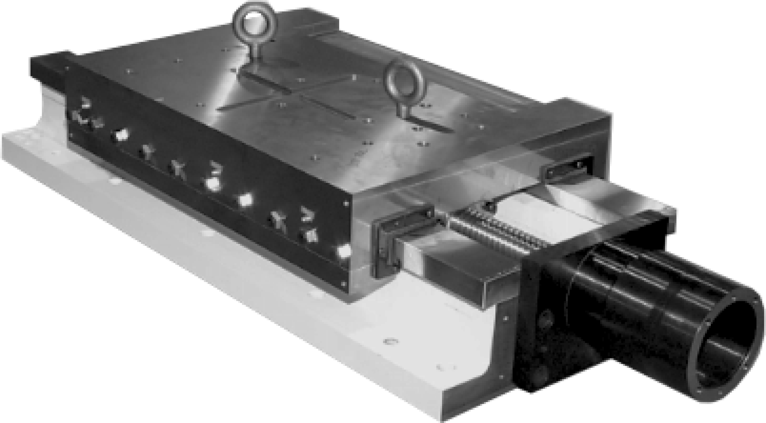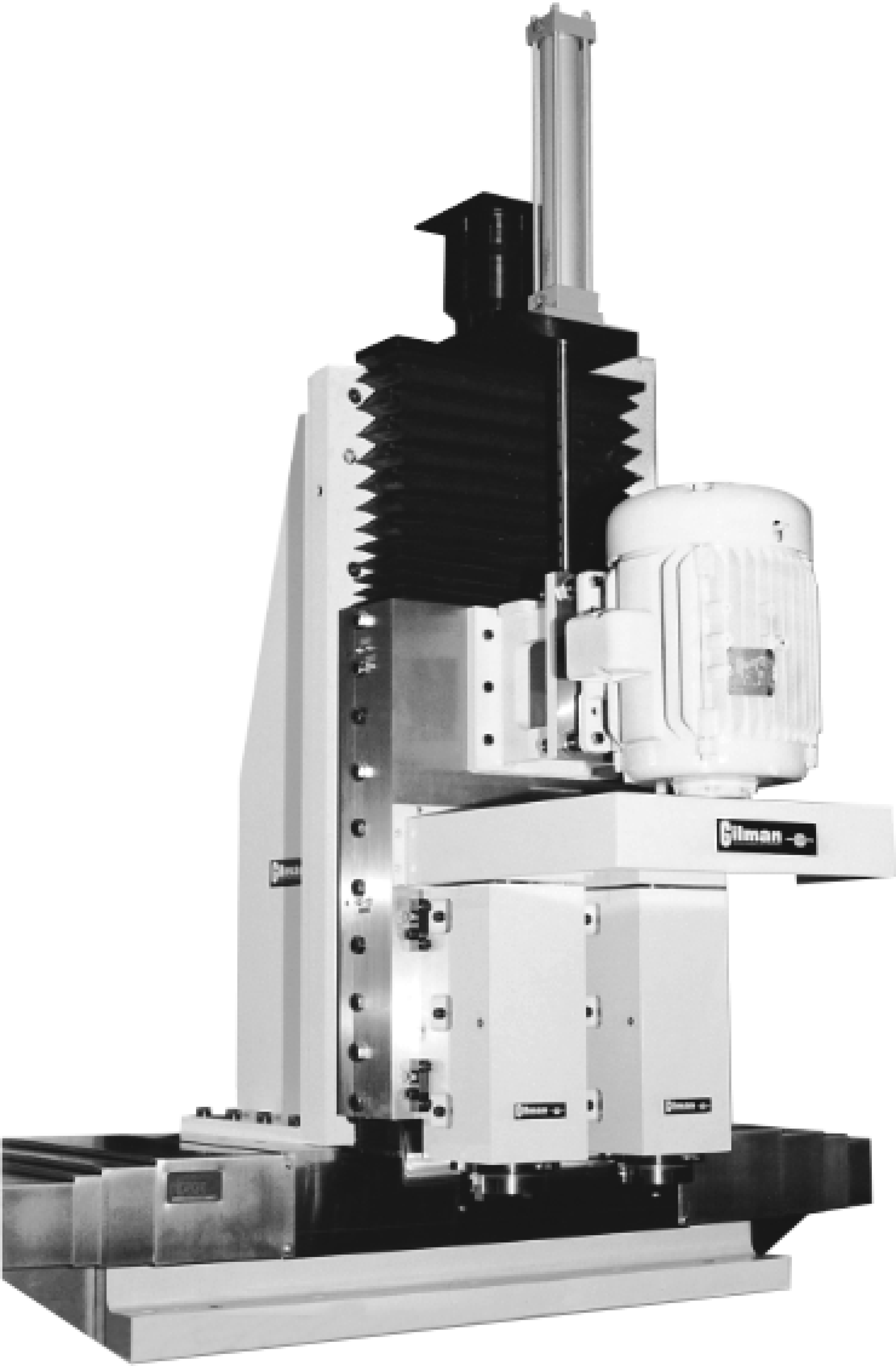 Through a joint development process including the manufacturer, the machine tool builder and Gilman, a unit was designed that met all of the end-user requirements. The base chosen was a hardened steel way slide with preloaded ground ball screw driven by a single phase motor. A vertical angle bracket supports another hardened steel way slide with preloaded ground ball screw driven by a single-phase motor. Spindles chosen were Gilman model 6500B with a block housing and triplex ball nose bearing arrangement and labyrinth seal. The shaft nose was 50 NMTB taper. The design retained the single motor drive. The customer supplied reduction unit turns the first spindle at 2,900 RPM and the second spindle at 1,950 RPM.